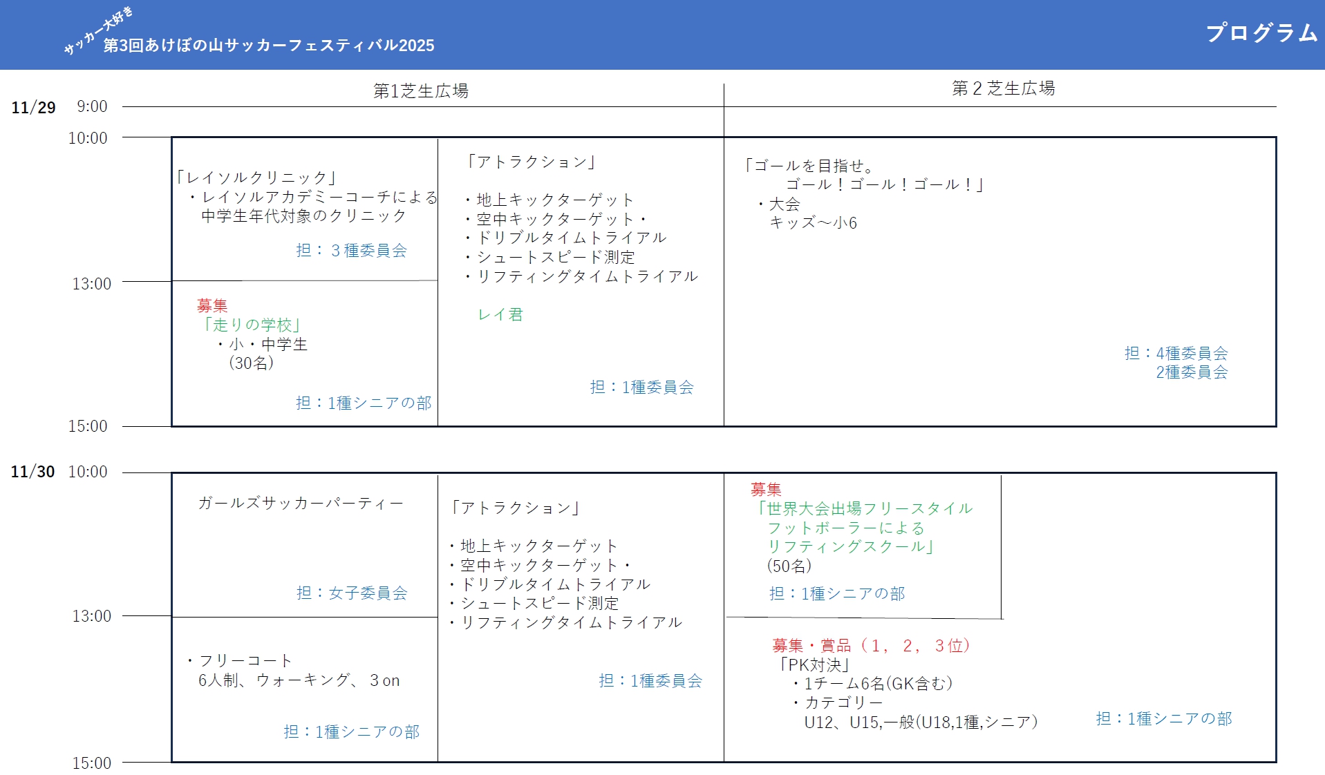 | 第2広場 | 「PK対決」10:00~15:00 事前申し込み必要対象:全世代 1チーム3人によるPK対決1チーム4本(同じ出場は3本迄)同点はサドンデス カテゴリーはU12(男・女混合あり小学生用ゴール使用)と一般(U13以上シニア男・女混合あり)。ファミリー(特別ルールあり) |